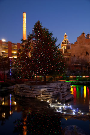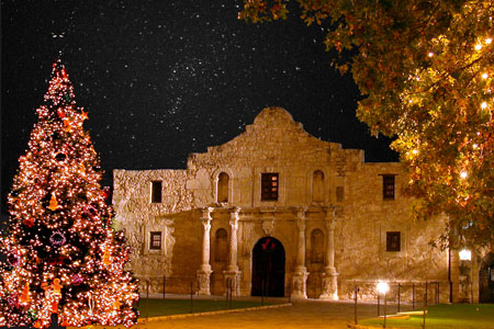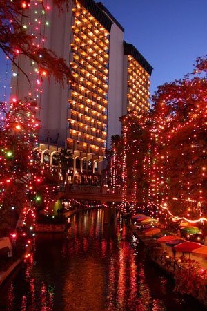 Reverse side text: Each year during the Christmas season, San Antonio treats River Walk visitors to a dazzling display of lights strung from graceful cypress branches. In the background, the Hilton Palacio del Rio hotel is a San Antonio landmark and a favorite destination for tourists and convention visitors. It was rushed to completion in 1968 for the opening of the HemisFair, using cranes to lift modular rooms into place that had been assembled off-site and completely furnished down to the towel racks and soap in the dishes.