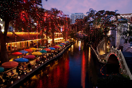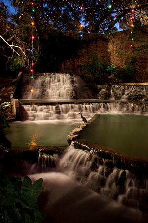 Reverse side text: The San Antonio River Walk teems with holiday revelers during the Christmas season, yet there are many little-known nooks and crannies that offer a peaceful respite for water birds and people alike.