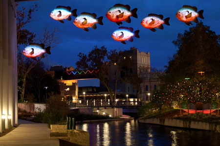 Reverse side text: On the newly opened Museum Reach of the San Antonio River Walk, Donald Lipski's F.I.S.H. sculpture is a new city landmark. The illuminated, piscean fiberglass figures are suspended from the I-35 bridge and are long-ear sunfish that are native to this stretch of the river. The building in the background is the San Antonio Museum of Art.