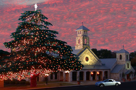 Reverse side text: Carved from the banks of Helotes Creek, this charming and intimate church honors the patroness of the Americas, the Virgin of Guadalupe. A sunken altar looks up towards curving rows of pews that slope toward street level. Behind the altar, windows frame a peaceful view of the wooded creek bed. Near the church's entrance, a large natural pine tree is a Christmas sentinel at the edge of the Texas Hill Country.