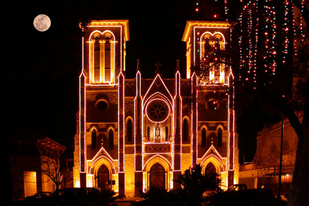 Reverse side text: The San Fernando Cathedral in San Antonio, Texas is the oldest cathedral sanctuary in the United States and the oldest parish church in Texas. The cornerstone of the church was laid in 1738, and the dome marks the geographic center of the City. In 1836, the Battle of the Alamo began after Mexican General Santa Anna raised the flag of "no quarter" from the tower of the church. In the back of the cathedral there is a marble coffin that bears notice the remains of the defenders of the Alamo are buried there. San Fernando Cathedral is not exclusively a Catholic cathedral - it functions as a center of unity and harmony for all the God-loving people of San Antonio and beyond. Over 5,000 people participate at weekend Masses each week of the year.